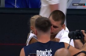 8月22日讯 今日欧锦赛热身赛,塞尔维亚男篮106-72大胜斯洛文尼亚男篮。赛后约基奇与东契奇亲密互...