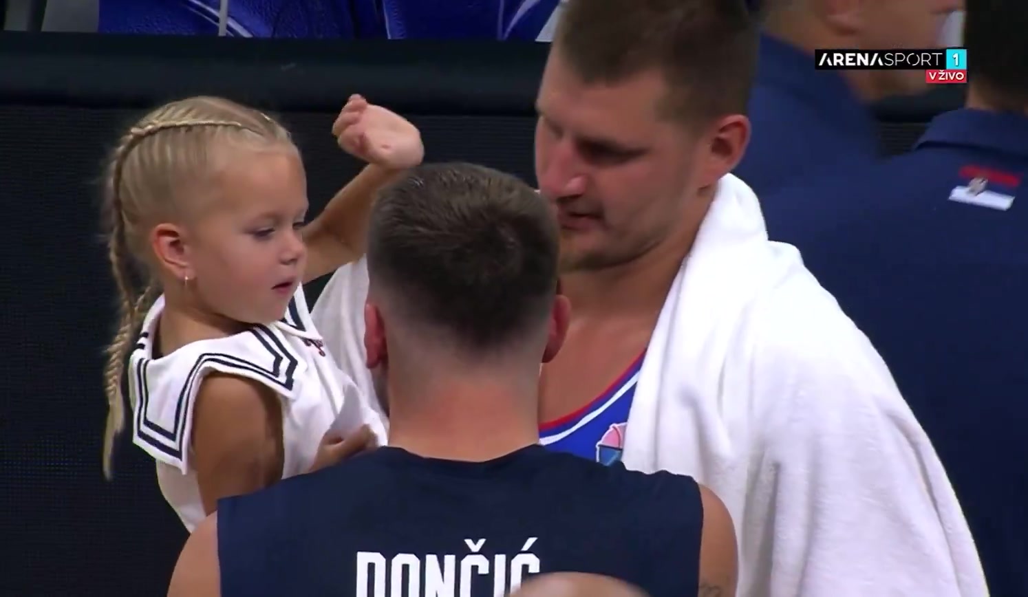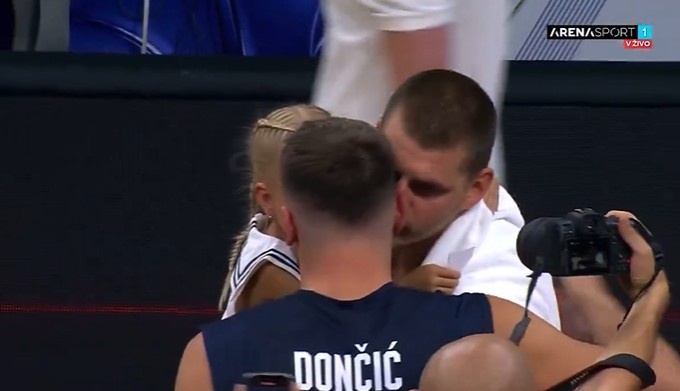 赛后约基奇与东契奇亲密互动,前者亲吻了后者的脸颊。