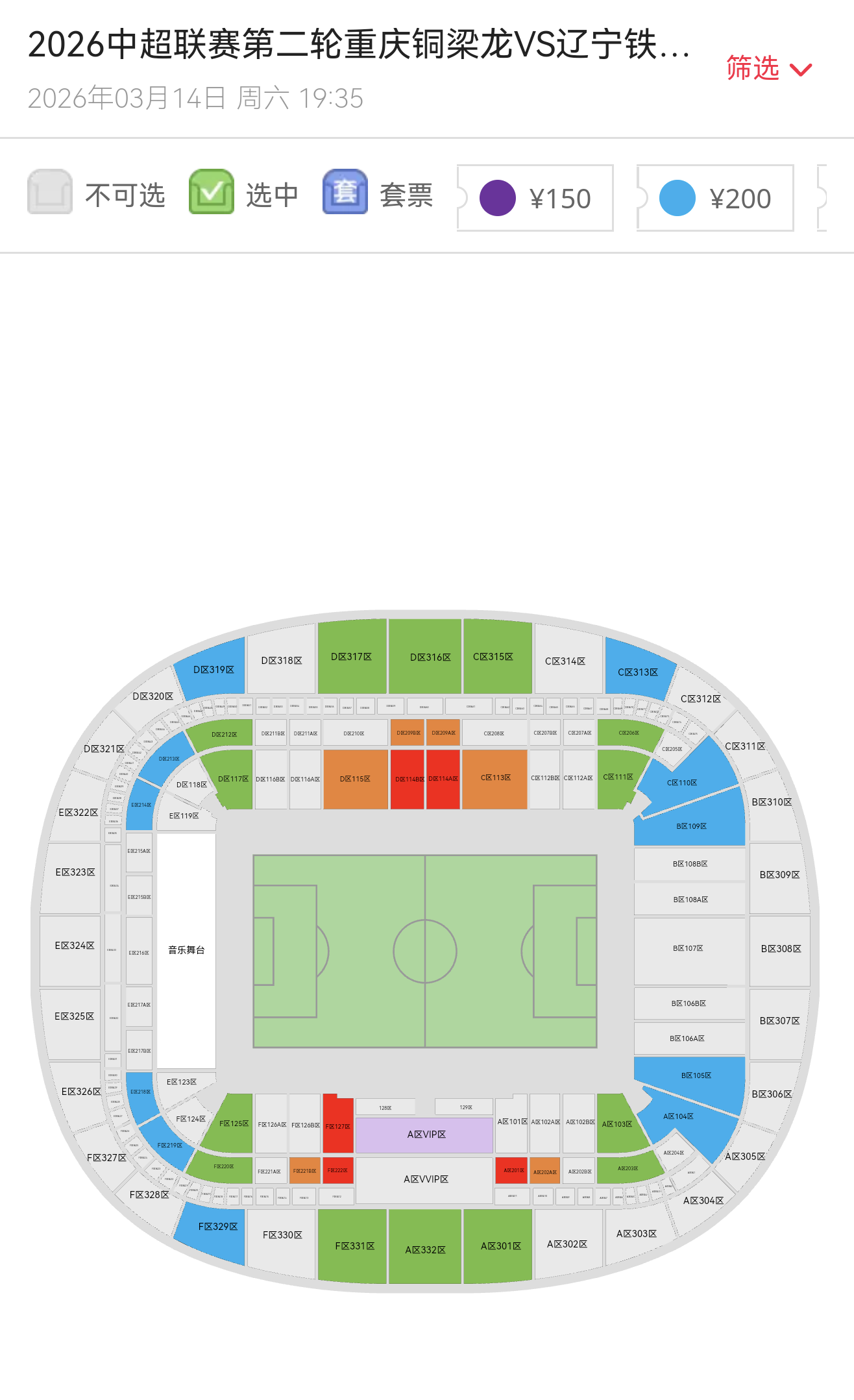 重庆铜梁龙首个主场比赛球票热销(灰色为已经售出区域)。网络截图